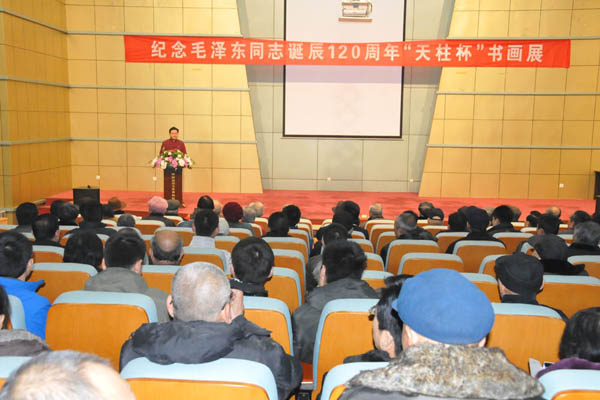 为纪念中国人民的伟大领袖、缅怀毛泽东同志的丰功伟绩,宣传贯彻党的十八届三中全会精神,全面落实市委、市政府提出的“东融西借、跨越赶超,建设冀鲁豫三省交界科学发展先行区”的战略决策,实现中华民族伟大复兴的“中国梦”。12月17日,由山东天柱建设监理集团有限公司、聊城市老年书画研究会西城分会联合举办的“纪念毛泽东同志诞辰120周年暨‘天柱杯’聊城市书画展”在运河博物馆四楼展厅正式开幕。聊城市住建委王爱生主任、聊城市老年书画研究会李恒聪会长、集团公司董事长、总经理张宝柱以及市直和各县市书画家出席开幕式。聊城市电视台、大商传媒、市住建委新闻中心对本次活动进行了现场宣传报道,本次书画展将持续到18日。 本次书画展,邀请了聊城市老年书画研究会及市直和各县市老年书画研究分会的百位书画家,共计200余幅作品。书画有真草篆隶、微书篆刻、人物花鸟、白描素写,书画形神兼备,有的浓墨重彩,有的栩栩如生,艺术创作者以其特有的艺术领悟,渗透着时代内涵、文化内涵、精神内涵,集中展示了我市老年书画家的艺术魅力和知识才华。17日上午,共计有500余人参观了书画展。